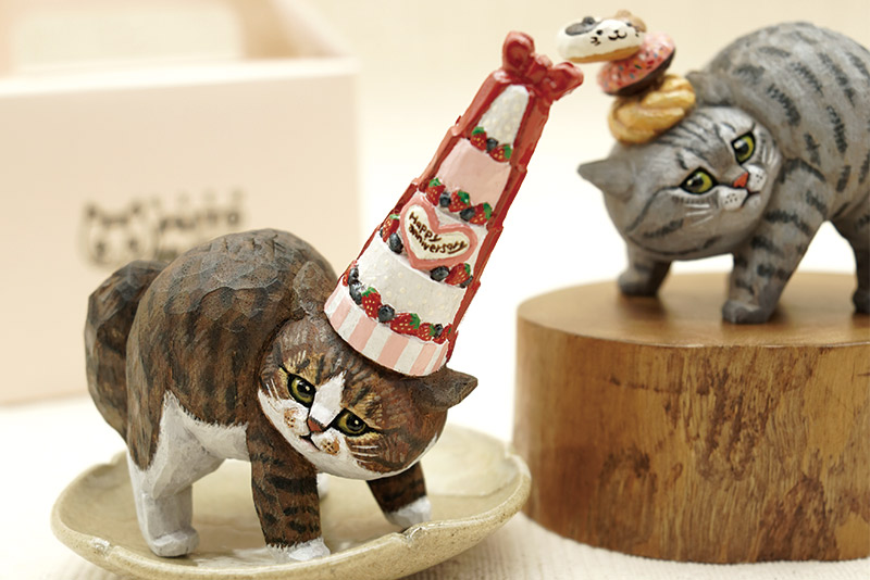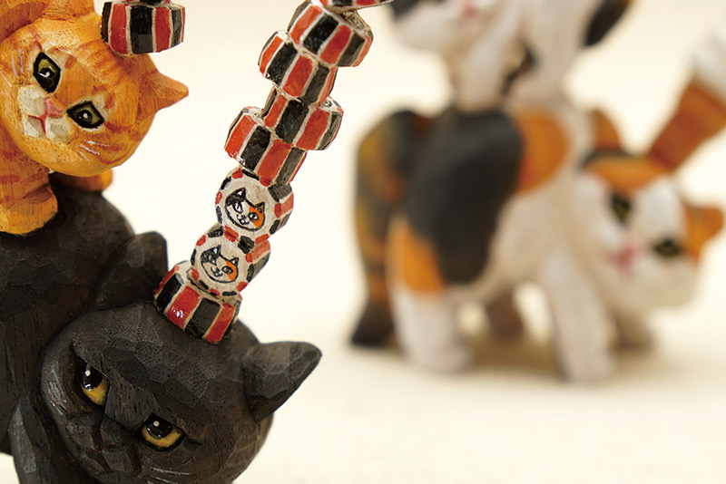 短大を卒業してからしばらくは、ずっと絵を描いていたというHITOMIKOさん。2018年までは、絵を描いたり、アクセサリーを作ったり。絵は、油絵やアクリル、パステルなど様々な画材使って描き、豊富な画歴を持つ。その後、父の影響もあり、ずっとしたいと思っていた木彫りを始めたらもう楽しくて楽しくて。「一木造り」と言われる、いわゆるひとつの木の塊から削り出された「やんのかシリーズ」はどの角度から見ても見事なそのフォルムに、彼女のデッサン力の高さが窺える。