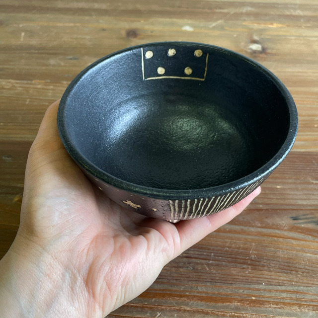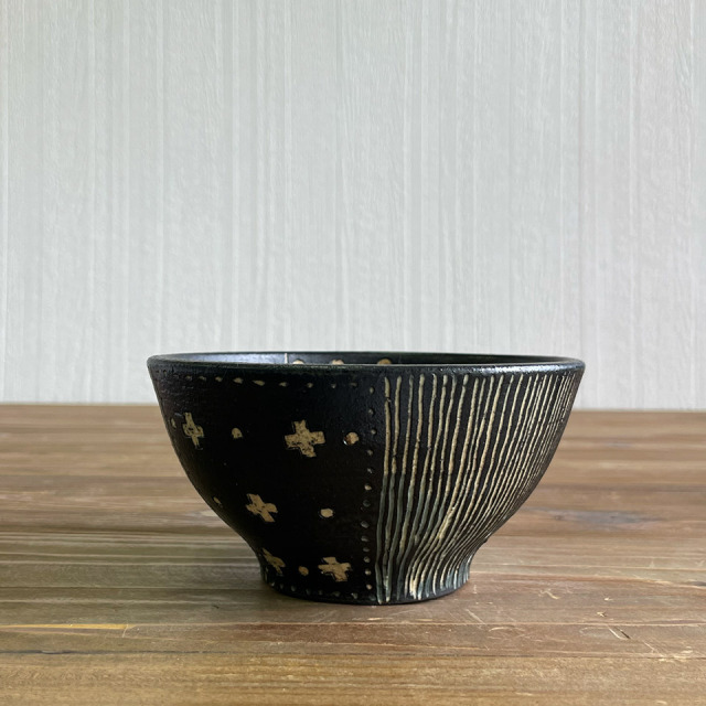 掻き落としの茶碗。深目の印象です。