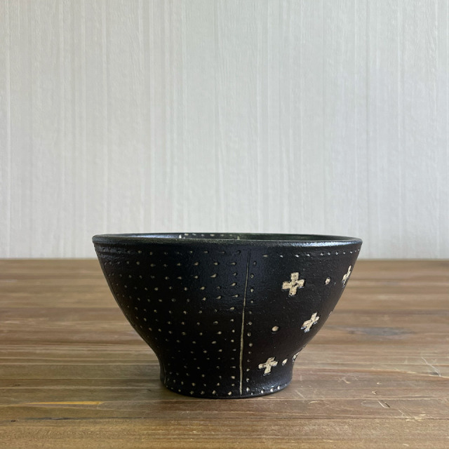 糸島市志摩の森の丘で陶芸の工房「studio2g」を開いた高須愛子さん。彼女の作品は、黒一色の素地に手描きの水玉や小花、線刻などの模様をあしらうというユニークなスタイルが特徴。彼女が作り出す黒色は重苦しさがなく、むしろモダンで可愛らしい印象があり、日々の食卓を彩ります。