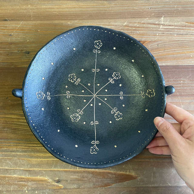糸島市志摩の森の丘で陶芸の工房「studio2g」を開いた高須愛子さん。彼女の作品は、黒一色の素地に手描きの水玉や小花、線刻などの模様をあしらうというユニークなスタイルが特徴。彼女が作り出す黒色は重苦しさがなく、むしろモダンで可愛らしい印象があり、日々の食卓を彩ります。