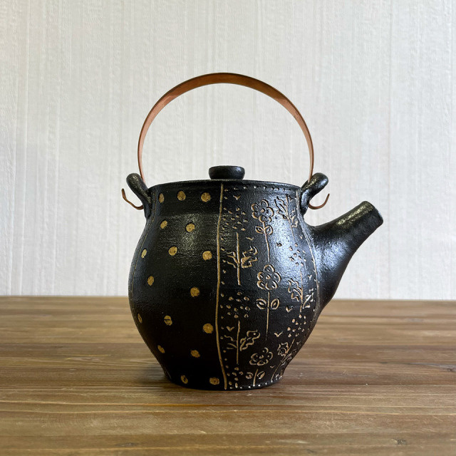 糸島市志摩の森の丘で陶芸の工房「studio2g」を開いた高須愛子さん。彼女の作品は、黒一色の素地に手描きの水玉や小花、線刻などの模様をあしらうというユニークなスタイルが特徴。彼女が作り出す黒色は重苦しさがなく、むしろモダンで可愛らしい印象があり、日々の食卓を彩ります。