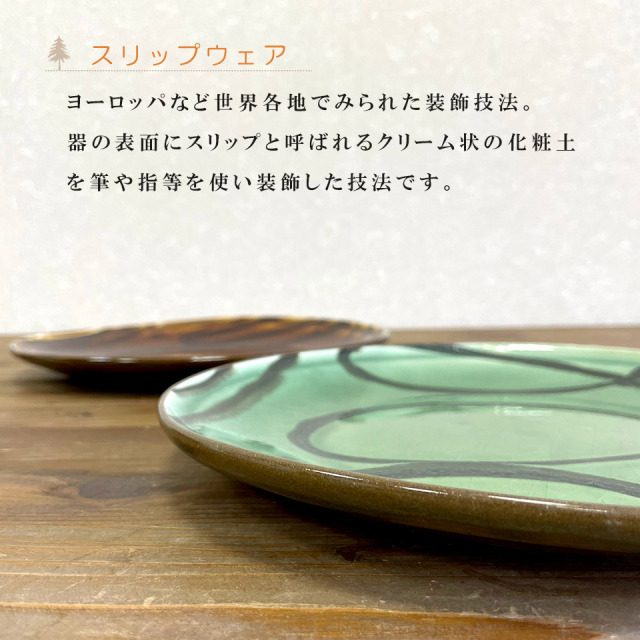制作過程ムービー ヨーロッパ伝統のスリップウェアという技法をほどこしたお皿です。風唄窯さんのスリップウェアは指で一枚一枚模様を描き出していて、曲線の具合や模様等同じものはふたつとありません。カラーはブラウンとグリーンの2色からお好きな組み合わせの2枚セットをお選びいただけます。