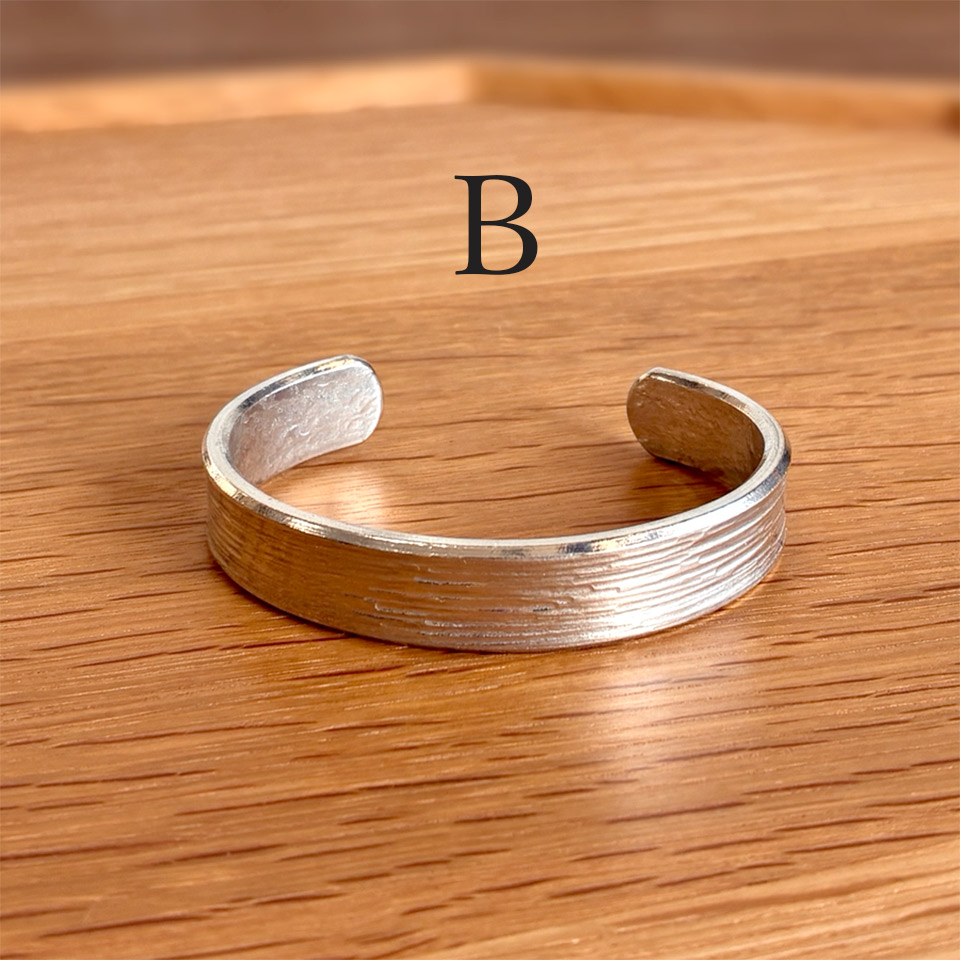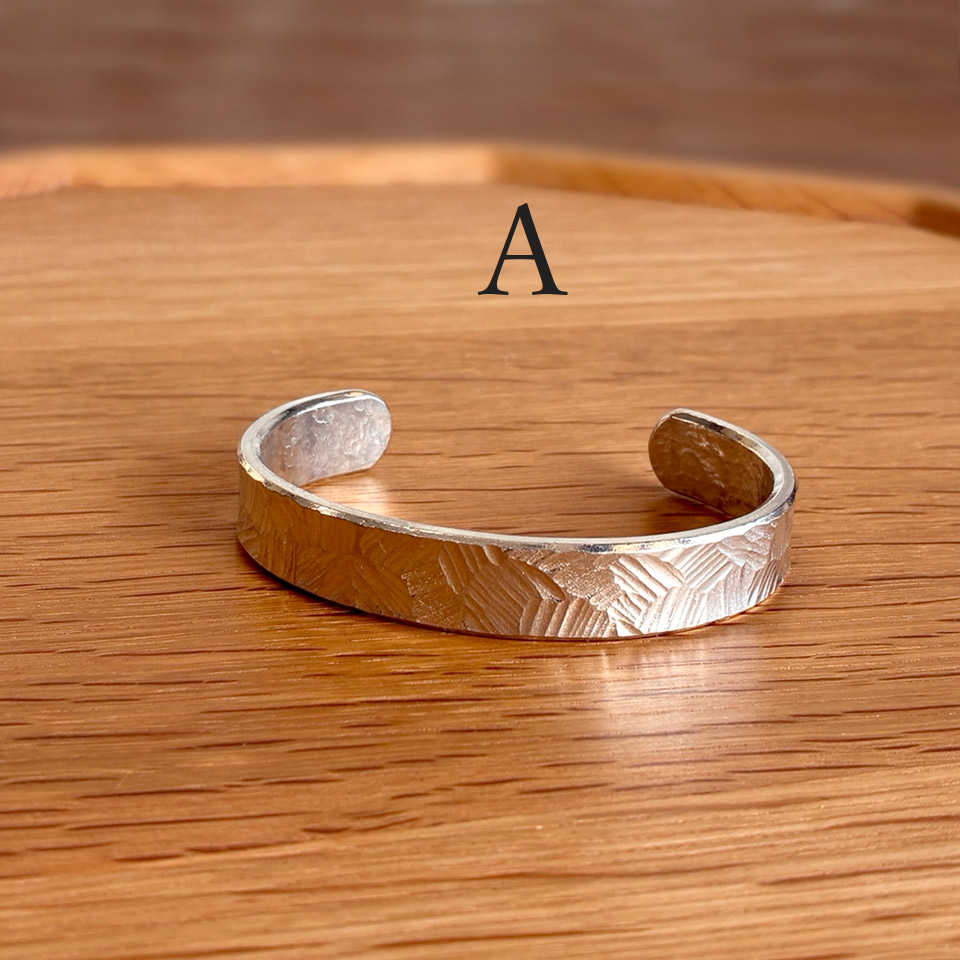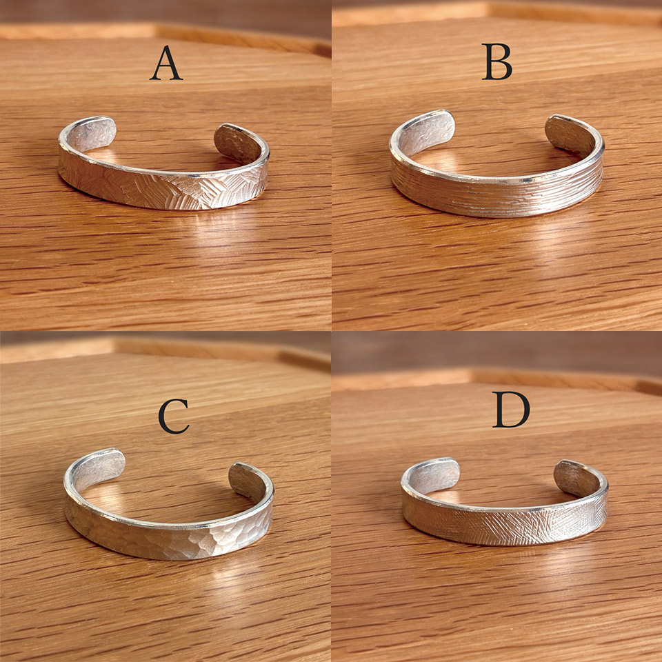 制作過程ムービー 飽きのこないシンプルデザインで幅も太めな錫のバングルは男女共に普段使いから楽しめます。脱着も簡単で模様は4タイプからお選びいただけます。