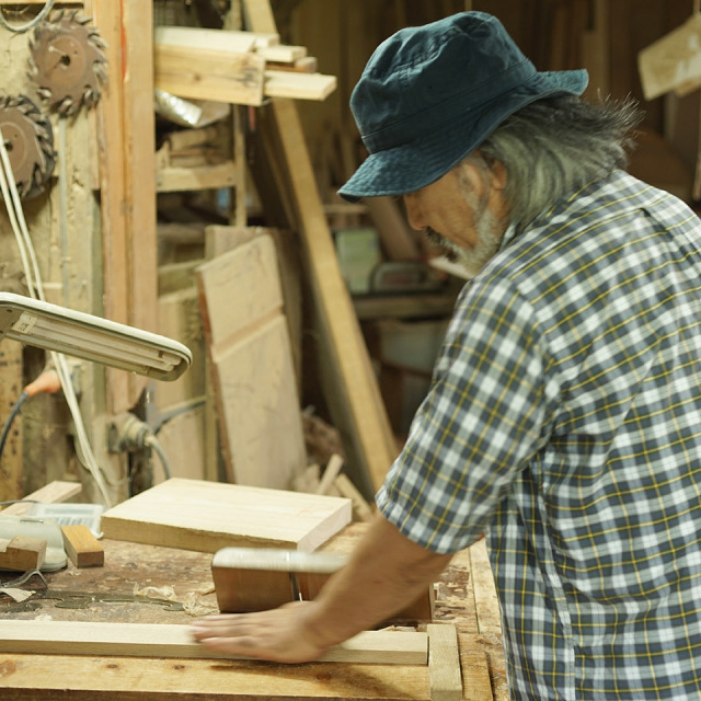 羊羹が好物だから、『陽寛』なのだと話すのは、森の番人を思わす池園陽寛さん。池園さんは様々な職歴を経て、30歳で木工の道へ。矢澤金太郎氏の仕事場に通いつめ、弟子入り。材と材を繋ぐホゾをあえてアクセントとして残す手法を継承しつつも、依頼主の希望にそった陽寛さんらしいあたたかい家具を提案しています。