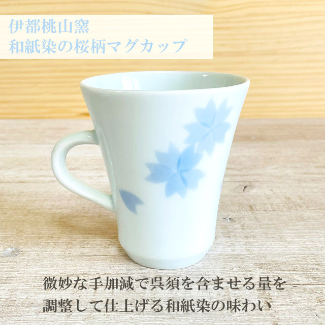 制作過程ムービー 和紙をハサミで切ったり、淡い仕上がりにしたい時は手でちぎり、陶器に和紙を載せて、筆で染める和紙染という技法を使った桜柄のマグカップ。