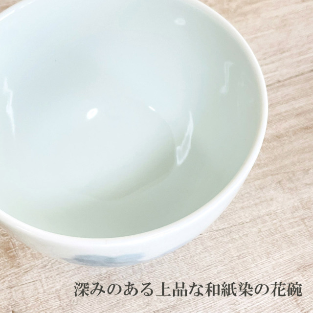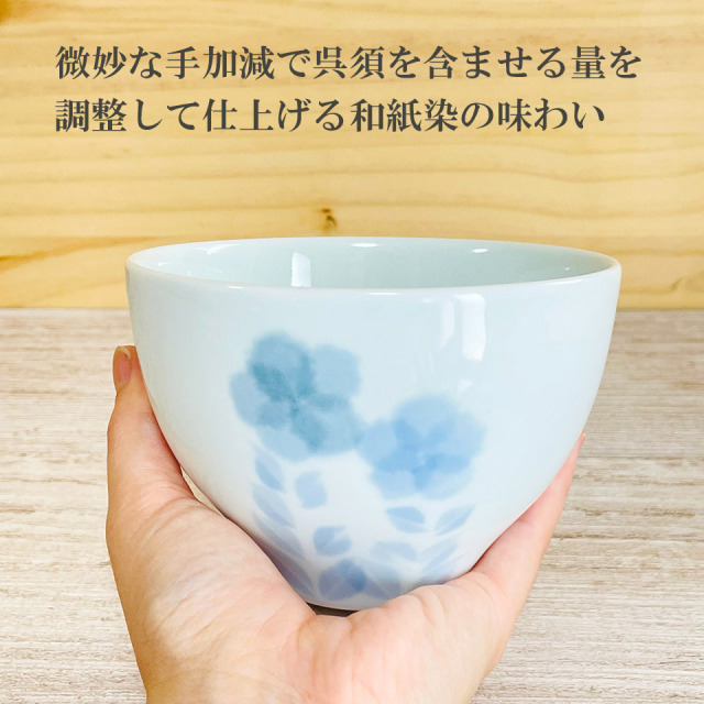 制作過程ムービー 和紙をハサミで切ったり、淡い仕上がりにしたい時は手でちぎり、陶器に和紙を載せて、筆で染める和紙染という技法を使った花紋のお碗。