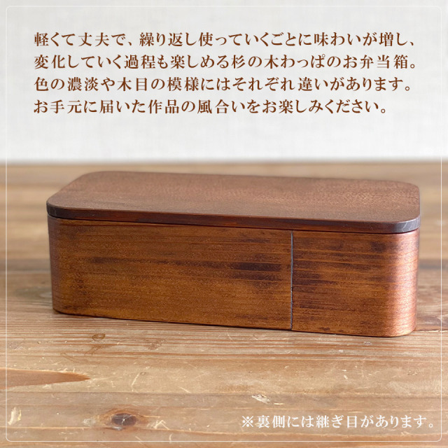 杉材は、吸湿性があり保温性もあるのでお弁当箱に適しており、木目をいかしたお弁当箱はステンレスやプラスチックのお弁当箱に比べてあたたかみがより感じられ、ご飯やおかずを美味しく味わえます。