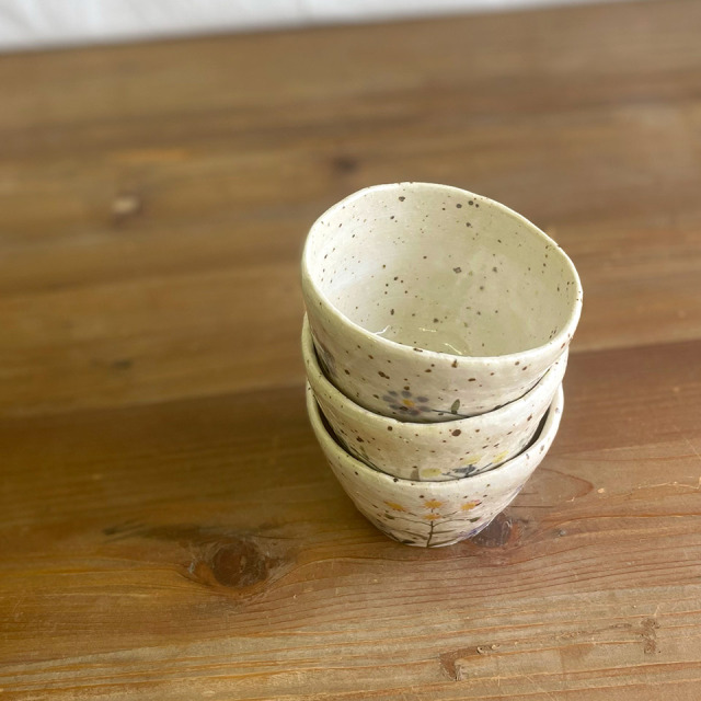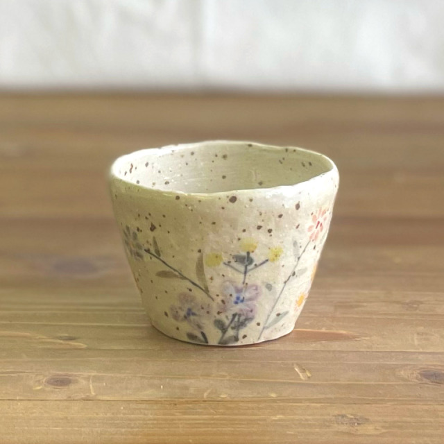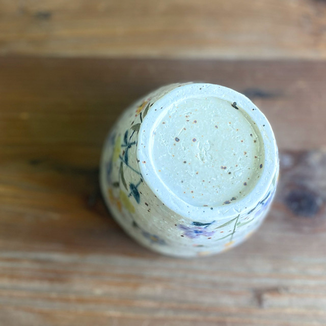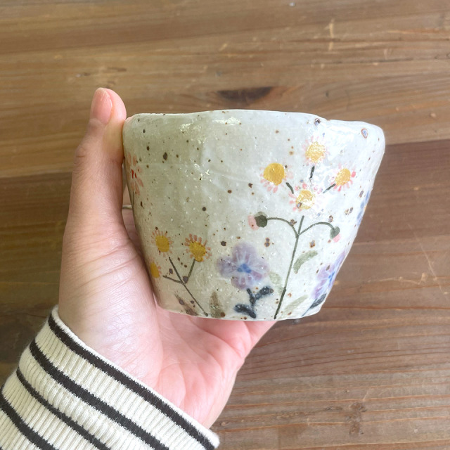 指先で土をつまみながら、まさに手びねりを繰り返して作り上げられたフリーカップ。花の小道をゆるりと散歩しているかの様な気分が味わえます。てびねり舎さんらしいまるで手のぬくもりが伝わってくるかの様なフリーカップです。つくりて てびねり舎(鎌田 恵子) サイズ 約Ф95mm × H65mm 素 材 陶器 注意事項 ギャラリーや他のサイトでも販売しているため、ご注文時点で在庫がない場合は制作に2~3ヶ月程度かかる場合があります。予めご了承下さい。