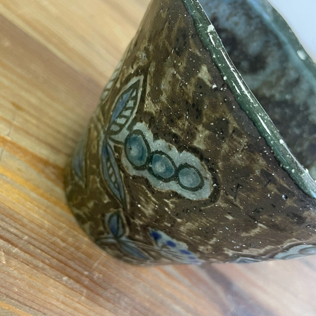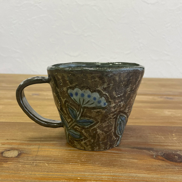 指先で土をつまみながら、まさに手びねりを繰り返して作り上げられた濃い焦茶色のマグカップ。彫絵された草花とシックな色味の落ち着いた印象のマグカップで、特別なティータイムを。てびねり舎さんらしい手のぬくもりが伝わってくるかの様な作品です。つくりて てびねり舎(鎌田 恵子) サイズ Ф100mm × H80mm 素 材 陶器 注意事項 ギャラリーや他のサイトでも販売しているため、ご注文時点で在庫がない場合は制作に2~3ヶ月程度かかる場合があります。予めご了承下さい。