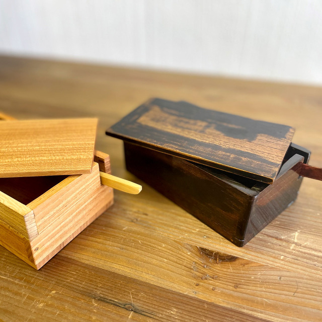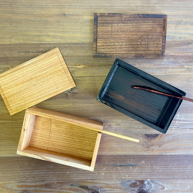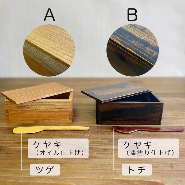 タイプは2種類。AタイプとBタイプで全く違った印象の仕上がりです。付属のナイフも、ツゲとトチで異なる素材を使用しており、お好みのタイプをお選びいただけます。つくりて 工作小屋moku-ren(品川雅男) サイズ 約W150mm×D90mm×H60mm(ナイフ:約160mm) 素 材 A:ケヤキ,ツゲ