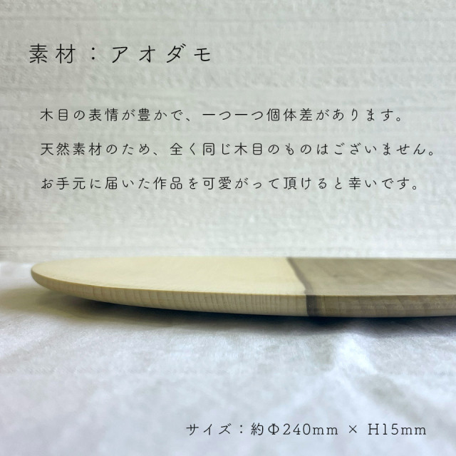 パンはもちろん、パスタやスイーツなど幅広くお使い頂けます。つくりて 工作小屋moku-ren(品川雅男) サイズ 約φ240mm×H15mm 素 材 アオダモ 注意事項 ギャラリーや他のサイトでも販売しているため、ご注文時点で在庫がない場合は制作に2~3ヶ月程度かかる場合があります。予めご了承下さい。