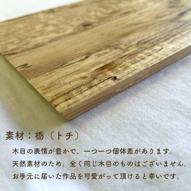 木製のプレートは落としても割れにくく、使いこむほどに味わいが増すので、自分色に育てていくのも楽しみのひとつですね。つくりて 工作小屋moku-ren(品川雅男) サイズ 約W280mm×D120mm×H10mm 素 材 栃(トチ) 注意事項 ギャラリーや他のサイトでも販売しているため、ご注文時点で在庫がない場合は制作に2~3ヶ月程度かかる場合があります。予めご了承下さい。