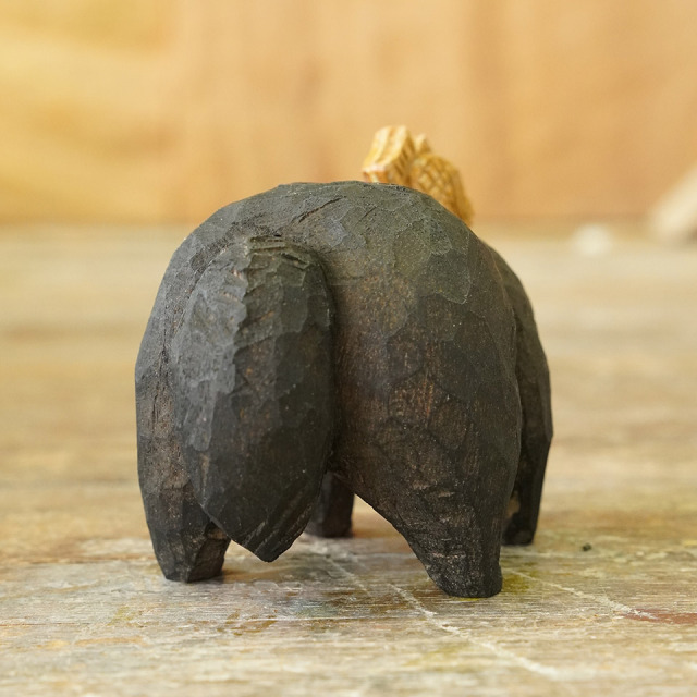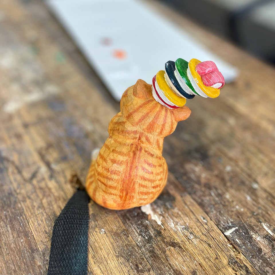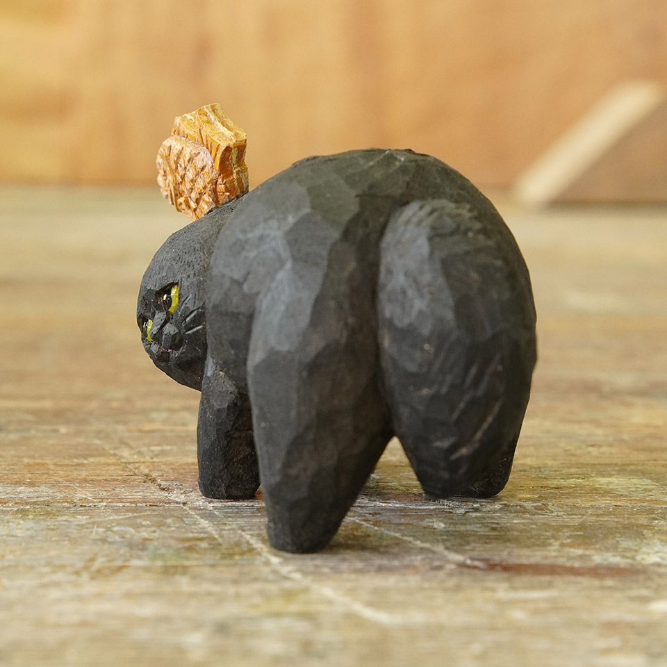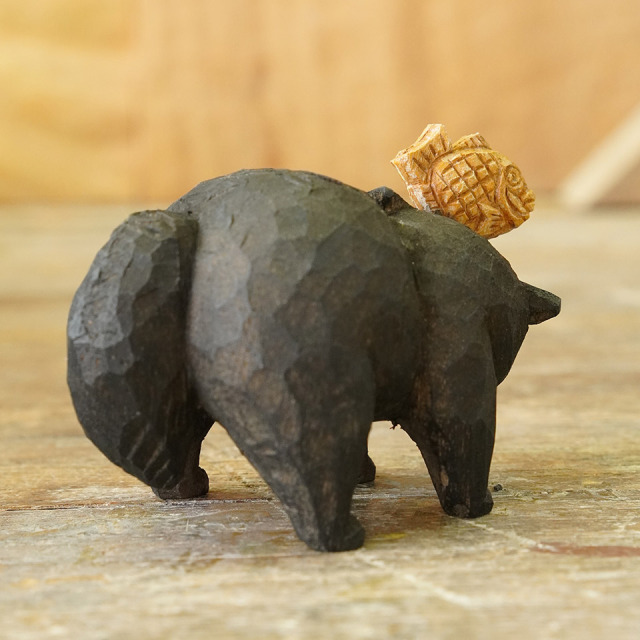 A black cat balancing a delicious taiyaki, fully packed with sweet red bean filling, on its head.Black cats and taiyaki make a great pair, so I made one before—and here it is again!つくりて HITOMIKO(木村 瞳) サイズ 約W80mm × D50mm× H60mm 重量 約46g 素 材 楠(クス) 注意事項 お使いのモニター設定、お部屋の照明等により実際の商品と色味が異なる場合がございます。予めご了承下さい。