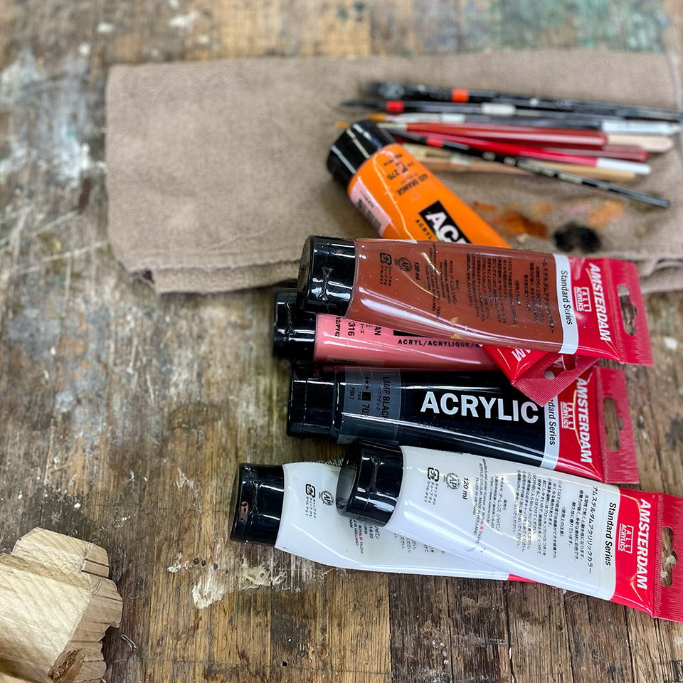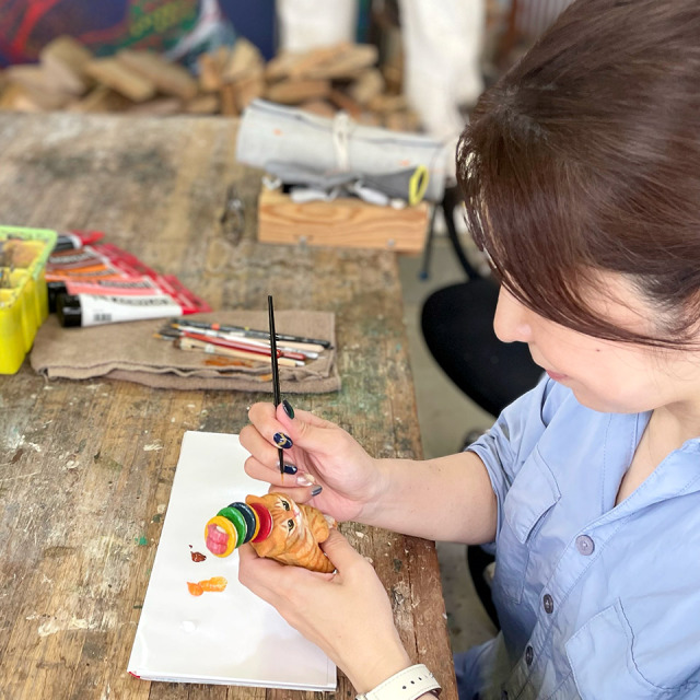 短大を卒業してからしばらくは、ずっと絵を描いていたというHITOMIKOさん。2018年までは、絵を描いたり、アクセサリーを作ったり。絵は、油絵やアクリル、パステルなど様々な画材使って描き、豊富な画歴を持つ。その後、父の影響もあり、ずっとしたいと思っていた木彫りを始めたらもう楽しくて楽しくて。「一木造り」と言われる、いわゆるひとつの木の塊から削り出された「やんのかシリーズ」はどの角度から見ても見事なそのフォルムに、彼女のデッサン力の高さが窺える。
