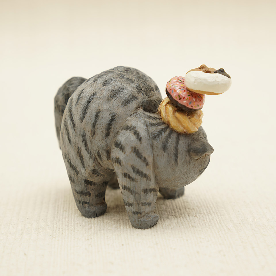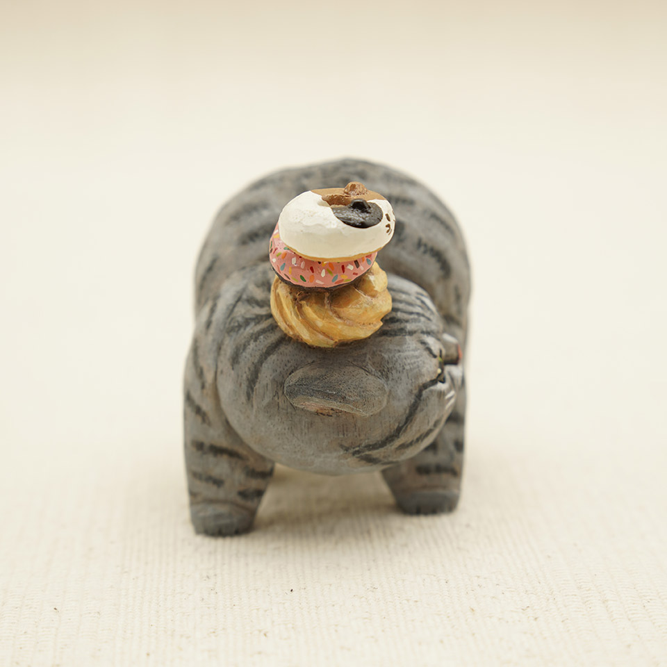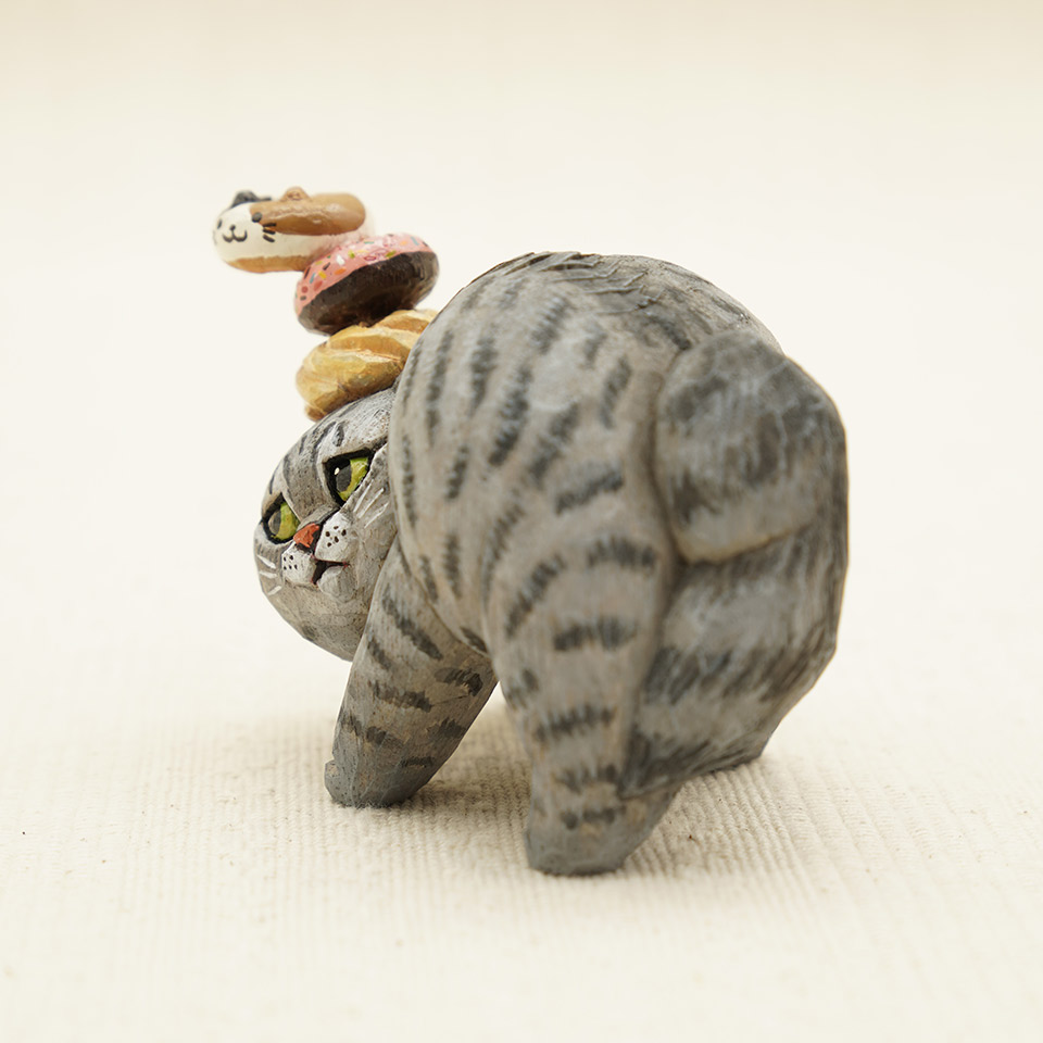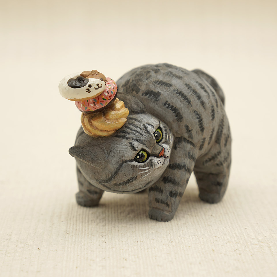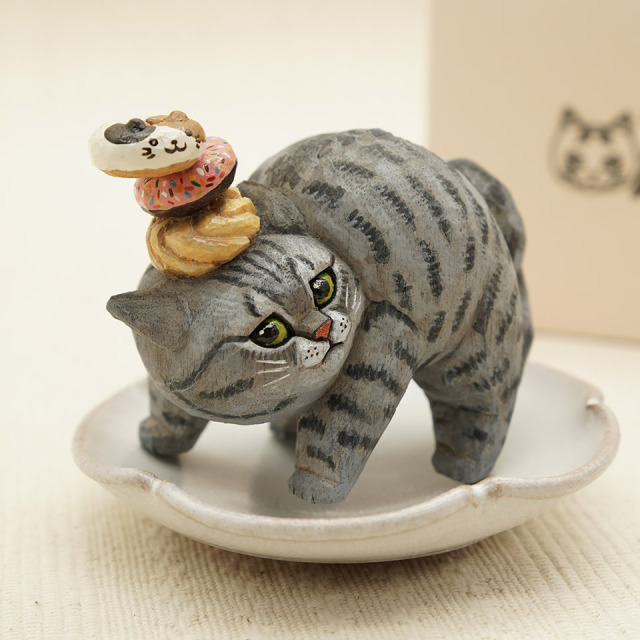 落ちそうで落ちない抜群のバランス感覚でドーナツを乗せたサバトラ猫ちゃん。作品は全て一点物です。