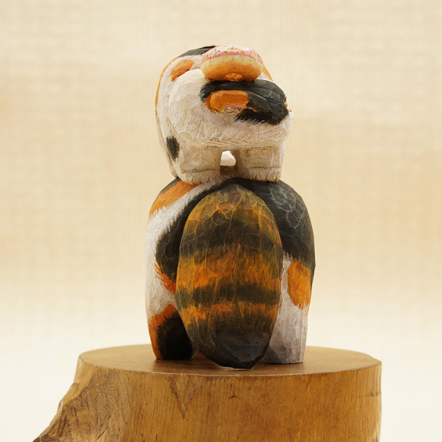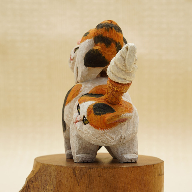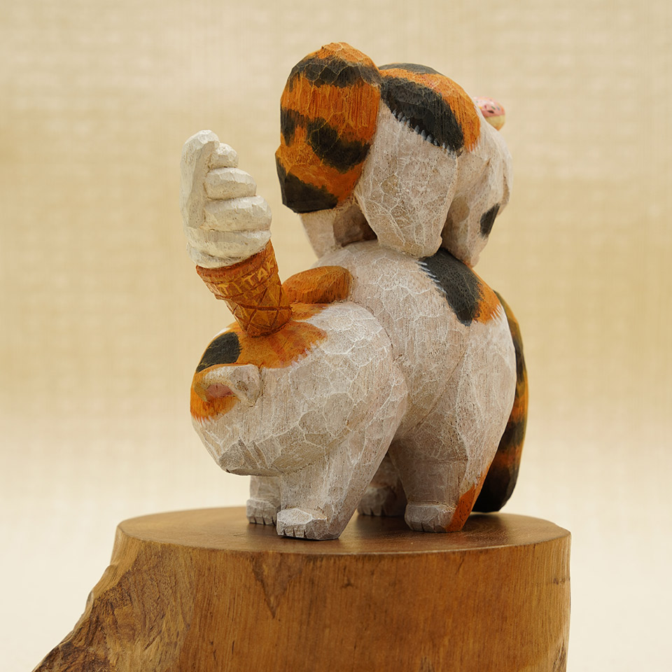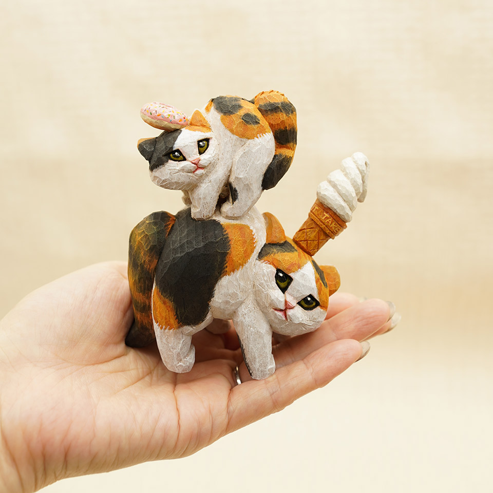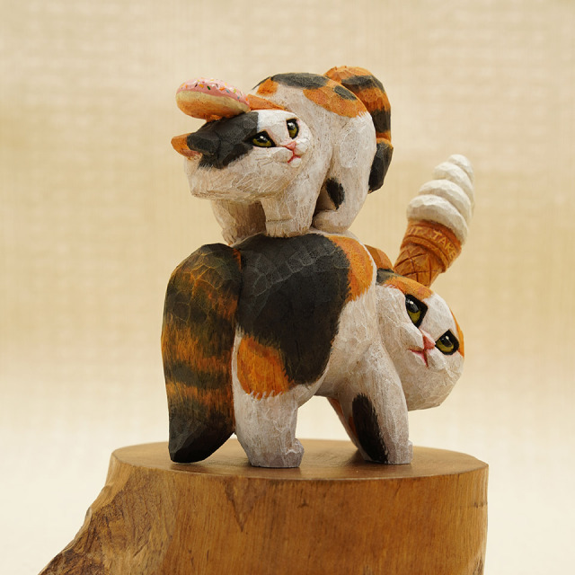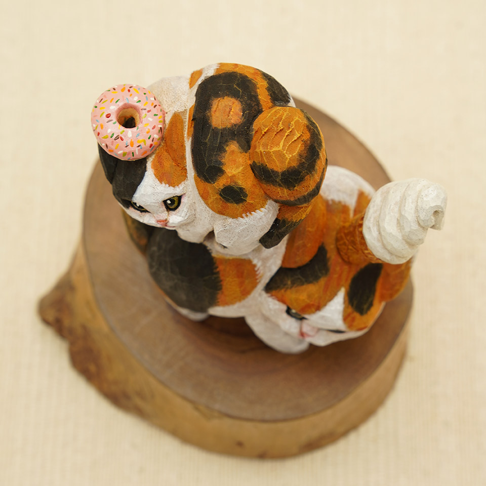 三毛猫おてんば娘はドーナツを乗せてご機嫌な様子。お母さんは、難易度の高いソフトクリームで親子仲良くやんのか?。作品は全て一点物です。つくりて HITOMIKO(木村 瞳) サイズ 約W85mm × D40mm× H105mm 重量 約97g 素 材 楠(クス) 注意事項 お使いのモニター設定、お部屋の照明等により実際の商品と色味が異なる場合がございます。予めご了承下さい。