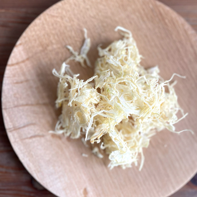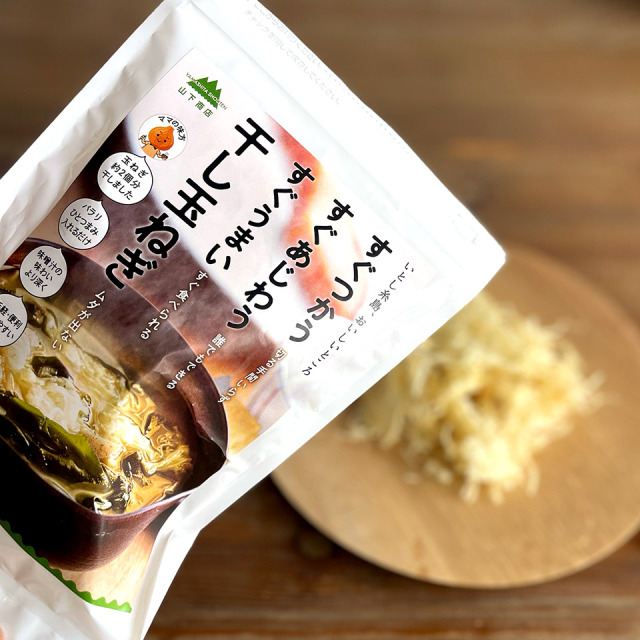 玉ねぎ約2個分を干しました。水戻しして水気を切り、サラダや酢の物に。味噌汁等の汁物にはパラリとひとつまみ入れるだけで玉ねぎの旨味たっぷり。手軽で便利、つかいやすい干し玉ねぎです。