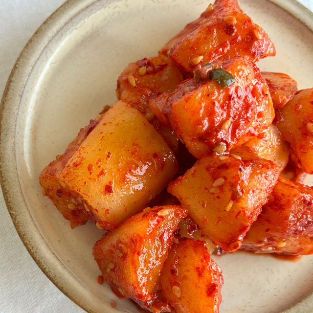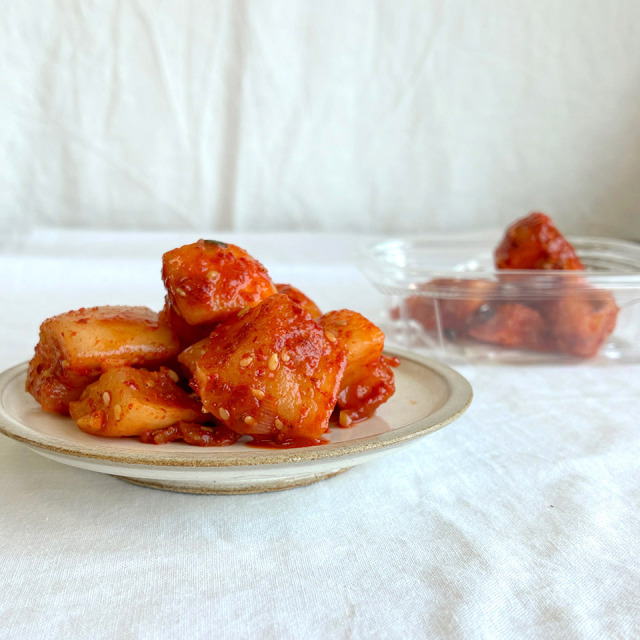 ヤンニョムの辛味とほんのりと酸味のある味わいが白米はもちろん料理にも合わせやすい一品。つくりて 玉家のキムチ工房 内容量 150g 原材料名 大根(国産)、唐辛子、いかの塩辛、生姜、にんにく、葱、胡麻、三温糖、塩、カナリエキス アレルギー なし 保存方法 要冷蔵(10℃以下)