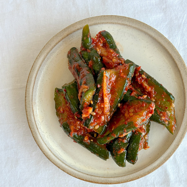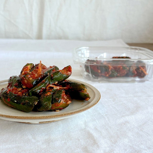 新鮮な胡瓜のカリッとした食感を残しつつ、唐辛子の辛味で胡瓜の甘みが引き立つ味わい。口に入れたあとに鼻を抜ける生姜の香りがたまりません。つくりて 玉家のキムチ工房 内容量 150g 原材料名 胡瓜(国産)、唐辛子、生姜、にんにく、胡麻、三温糖、塩/調味料(アミノ酸等) アレルギー なし 保存方法 要冷蔵(10℃以下)