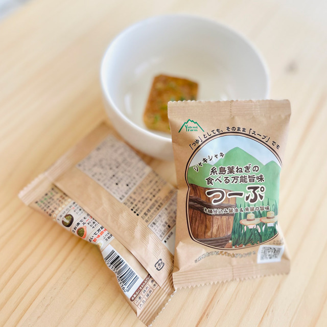また、砕いて万能うま味調味料にも。これひとつでパパッとスープ・つゆ・調味料にアレンジ。つくりて 弥冨農園 内容量 6.6g 原材料名 しょう油、チキンエキス、ブイヨン、でん粉、チキンオイル、こしょう、魚醤、でん粉分解物、酵母エキス、にんにくパウダー、生姜汁、具(ねぎ(福岡県糸島産))/酸化防止剤(V.E)、(一部に小麦・大豆・鶏肉・豚肉・魚醤(魚介類)を含む) アレルギー 小麦、大豆 保存方法 高温、多湿、直射日光を避け、常温で保存してください。