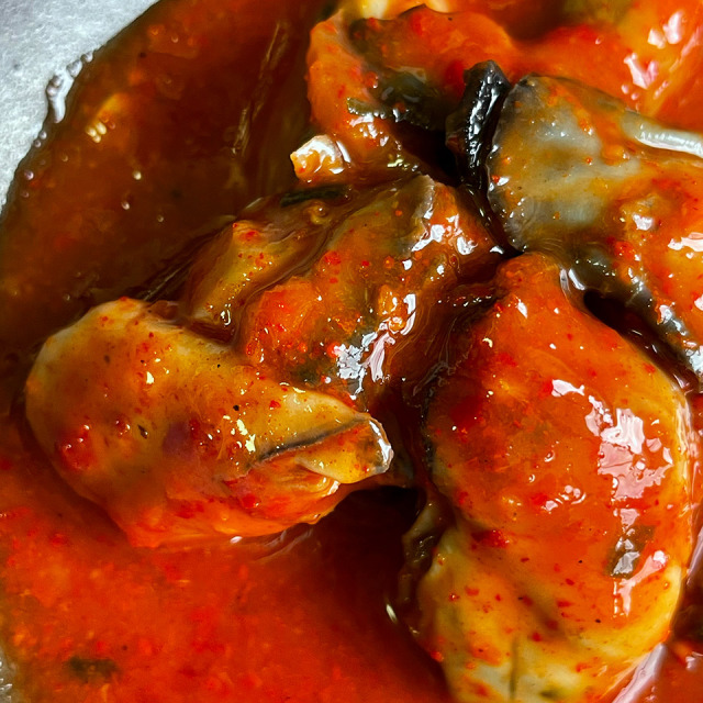 糸島産の牡蠣を蒸して、牡蠣キムチにしました。