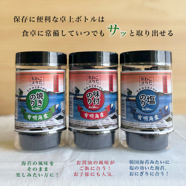 ご家庭で使いやすい卓上ボトルは食卓に常備しやすく、いつでも食べたい時や使いたい時にサッっと取り出せてとっても便利です。つくりて 博多海苔 内容量 8切50枚 原材料名 乾海苔(有明海産) 保存方法 直射日光を避け、高温多湿を避けてください。 アレルギー 原材料の海苔は、「えび・かに」が生育する海域で採取しています。