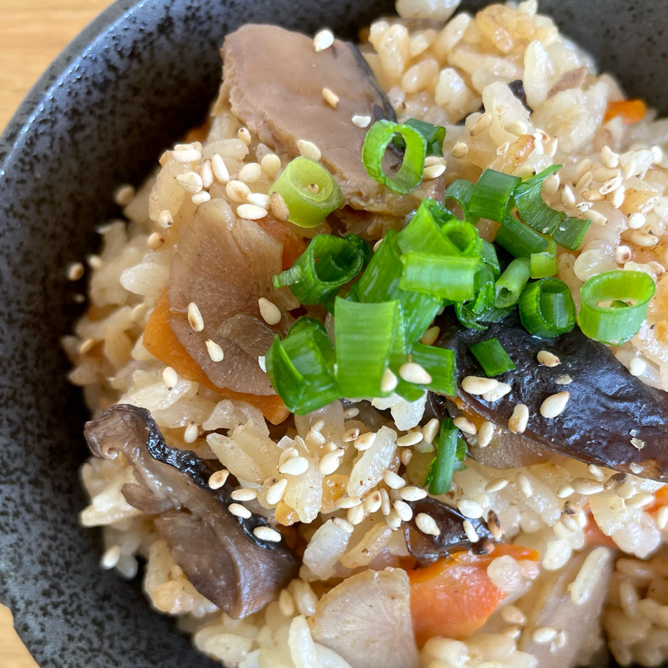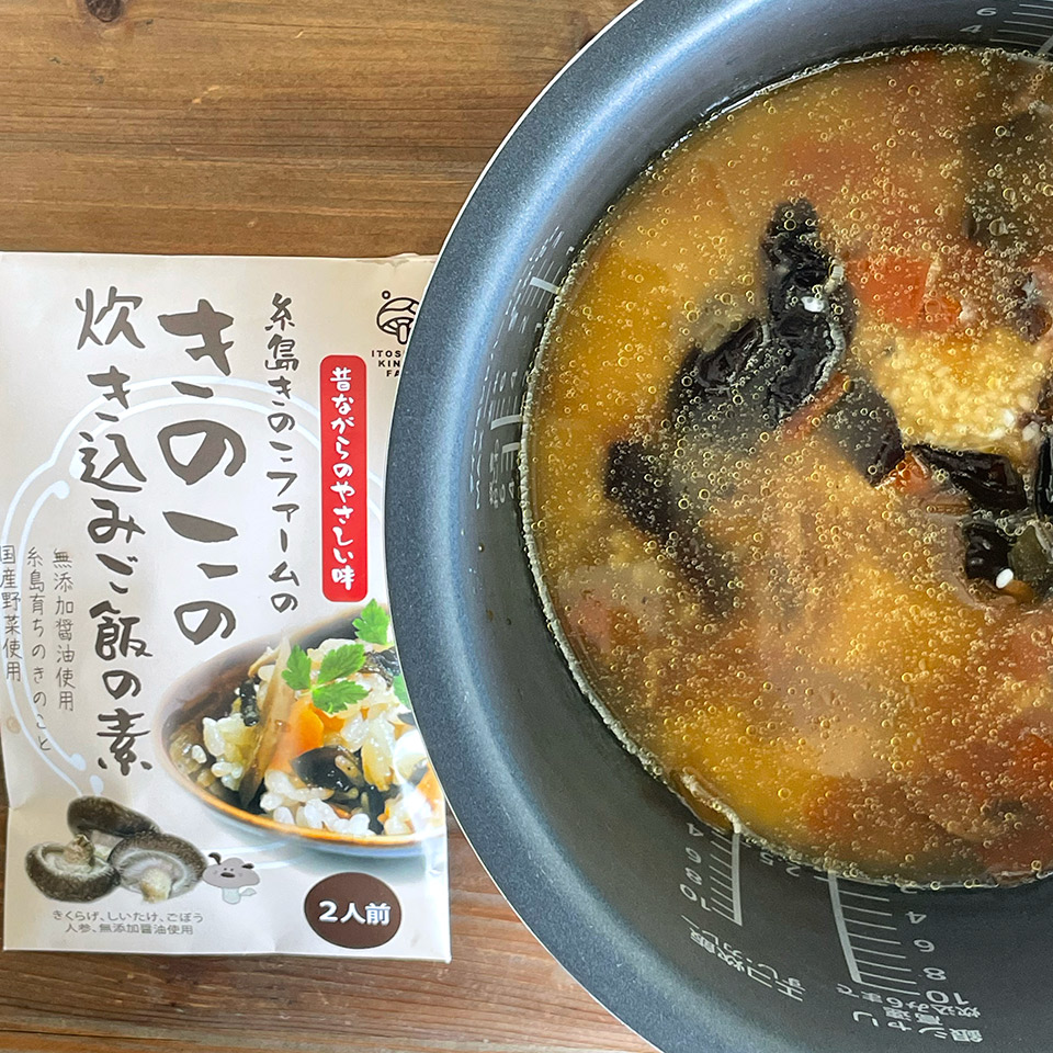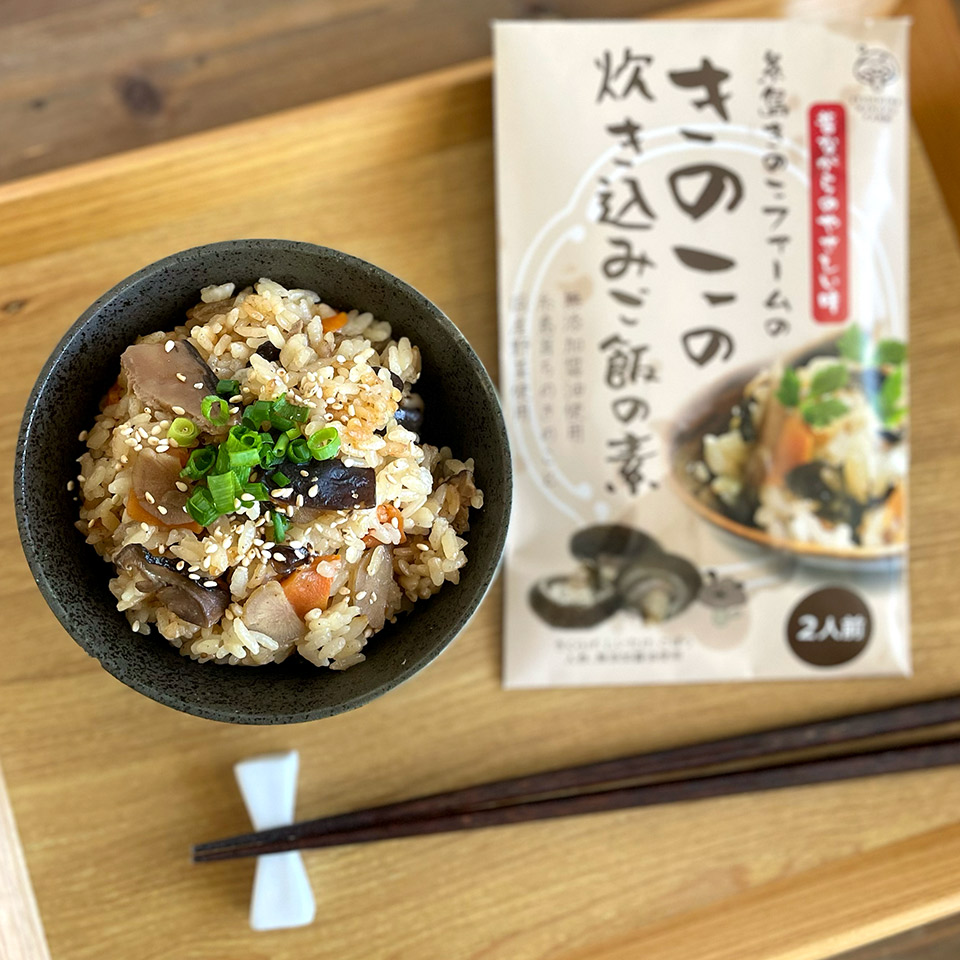 2合のお米を洗って、2合分の目盛りに合わせて水を入れきのこの混ぜ込みの素を入れて、軽くかき混ぜて炊飯してお召し上がりください。鶏肉を刻んで追加するとかしわご飯に。牡蠣を入れたら牡蠣飯に。アレンジも楽しめます。
