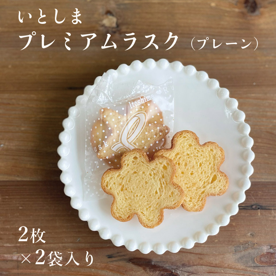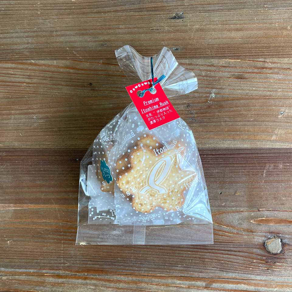 サクサク上品な食感と濃厚な味のフレーバーが楽しめる、糸島の牛乳「伊都物語」を贅沢に使用したプレミアムラスク。ラスク用にパン生地からこだわって作り一枚一枚丁寧に塗り上げ、焼き上げています。