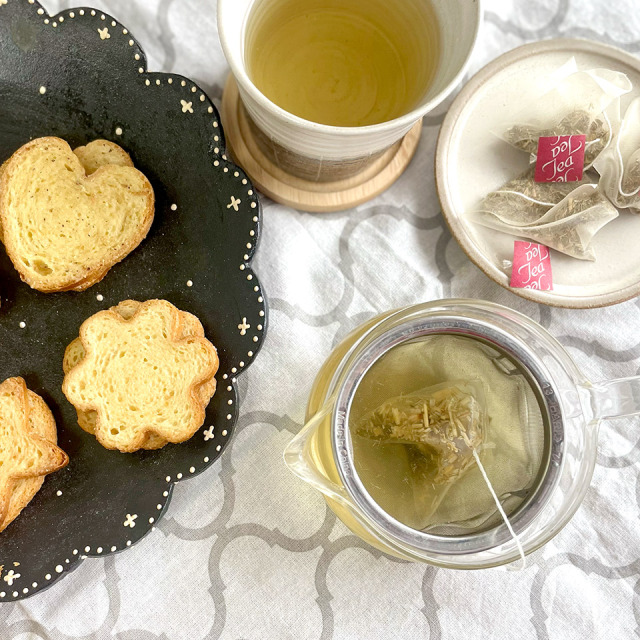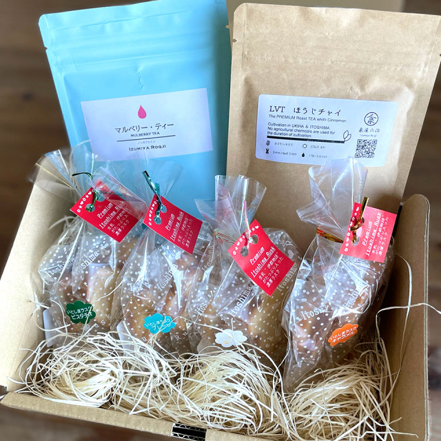 | 内容量 | マルベリーティー 7.5g(1.5gTB×5個) LVTほうじチャイ 7.5g(1.5gTB×5個) いとしまプレミアムラスク(プレーン・塩レモン・ピスタチオ・キャラメル):各24g×4種 |