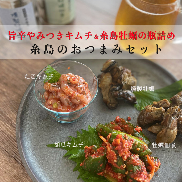 お酒のつまみに!ご飯のお供に!定番の胡瓜キムチと独特の食感がたまらないたこキムチの2種のキムチと糸島市福吉産の真牡蠣の瓶詰めのセット。牡蠣の瓶詰めは燻製と佃煮の2種類。どちらも、そのまま食べてよし。パスタやアヒージョなど料理に加えても◎