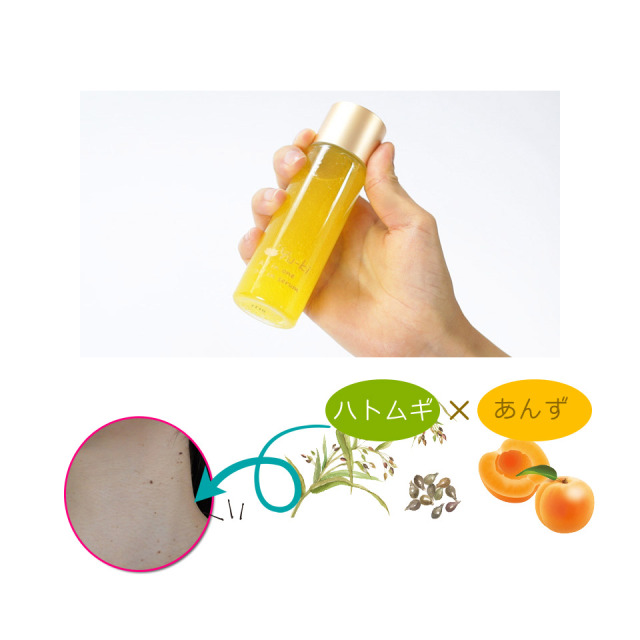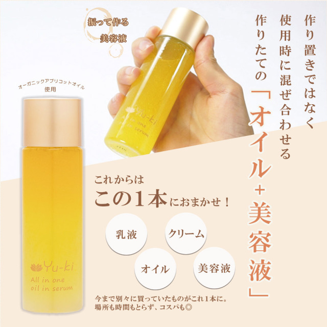 今までは別々に買っていた乳液・クリーム・美容液・オイル、これからはこの1本におまかせください。オーガニックのアプリコットオイルとヨクイニンがなじんで潤います。