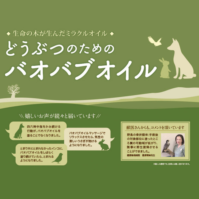 犬や猫、鳥、うさぎなど、指の噛み癖や皮膚炎の箇所をバオバブオイルでマッサージするとリラックスしながらコミュニケーションもとれます。つくりて バオバブサンライズ 内容量 10ml 成分 バオバブ種子油 ご使用方法 1、2滴ほどを飼い主さんの手のひらで伸ばし温めてから、対象部位(どうぶつの皮膚)に優しく塗りこんでください。
